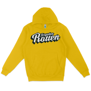 Black Comfort Colors T-shirt featuring a bold yellow and white "Forgotten Rotten" graphic design on the front.